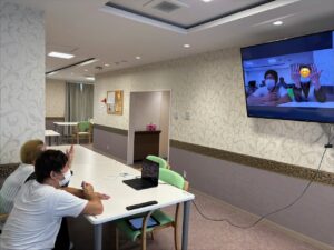 画面に向かって手を見せるご利用者様。「来週はブルーにする予定です」と会話されていました。