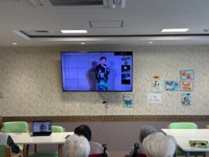 みなさんと一緒に「しあわせなら手をたたこう」を歌ってくださいました。ご利用者様も、手を鳴らしたり足を踏み鳴らしたりと、歌詞の動作に、一生懸命ついていこうとされていましたよ !(^^)!
